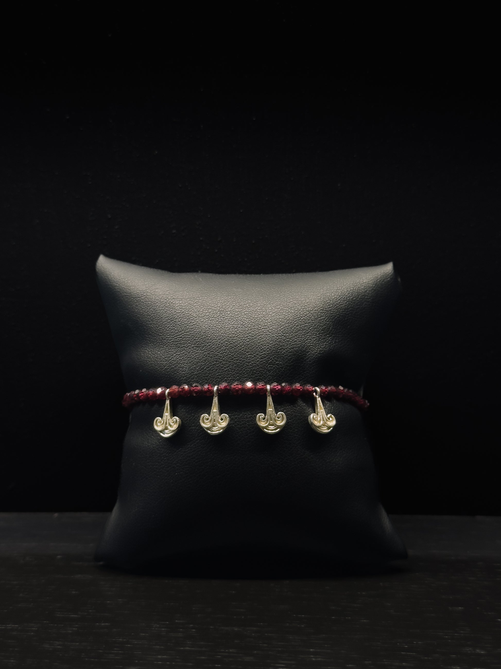 A striking bracelet featuring deep red beads accented with golden ikria charms. Inspired by the decorative motifs of Akrotiri’s frescoes.